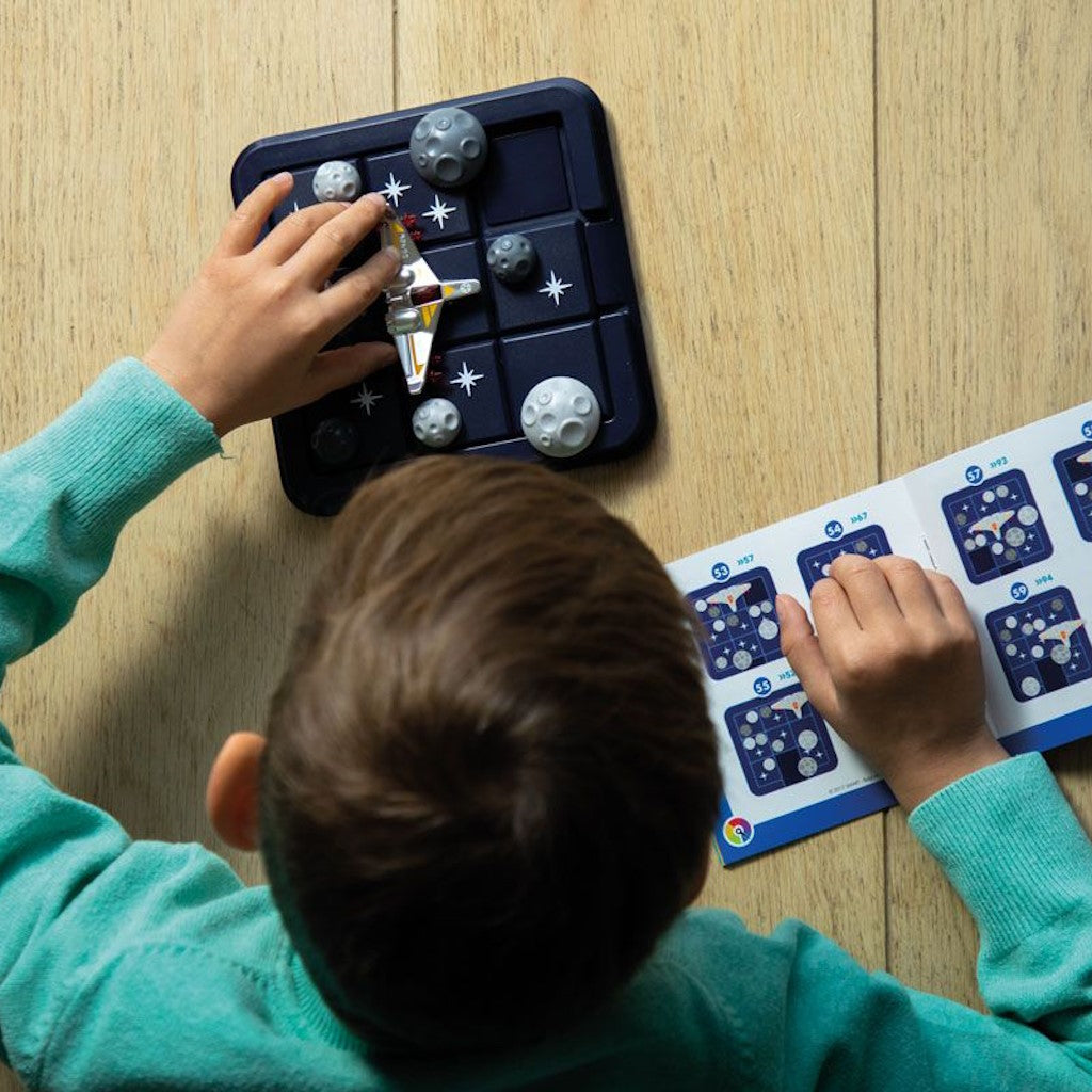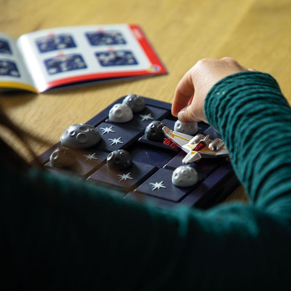 Contient : Plateau de jeu portable avec couvercle - parfait pour voyager, 1 vaisseau spatial, 7 pièces de jeu «astéroïdes», livret avec 60 défis et solutions
