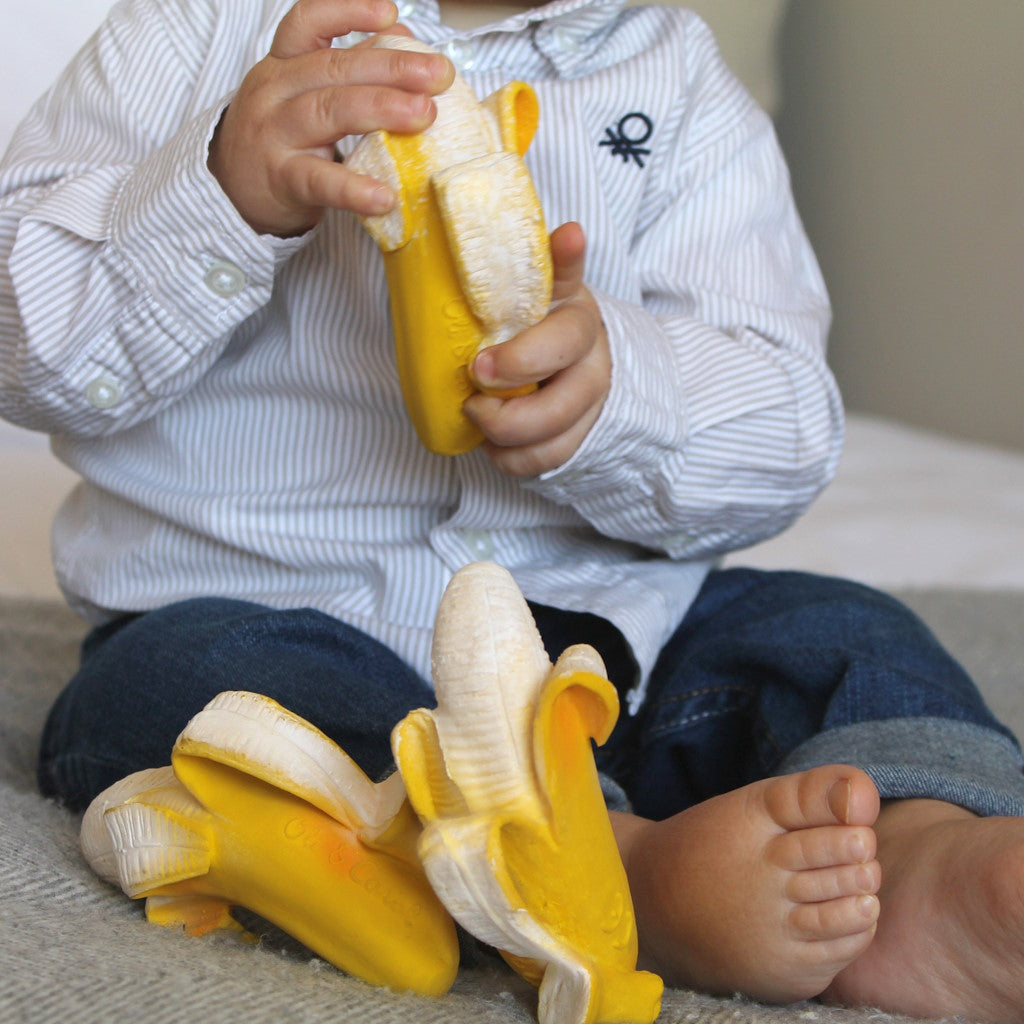 Ana Banana est un jouet de dentition en forme de banane qui stimulera les sens des bébés tout en apaisant leurs gencives pendant la poussée dentaire. De plus, sa texture réaliste les aidera à développer leur sens du toucher. Saviez-vous que les bananes sont riches en potassium, en fructose et en glucose ? Elles initient les enfants à une vie saine dès leur plus jeune âge !