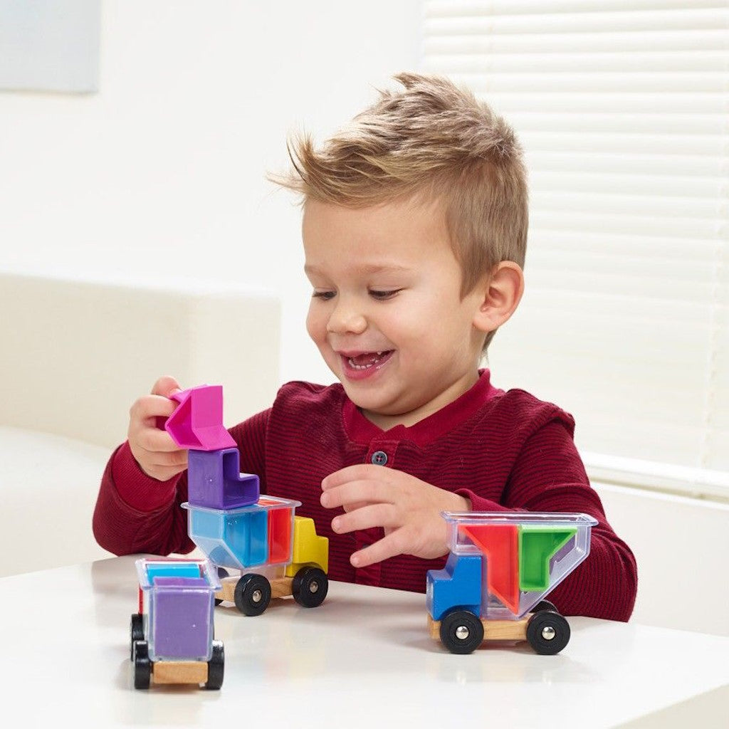 Il considérera d'abord les camions en bois comme des jouets qu'il pourra remplir et déplacer. Ensuite, il voudra résoudre les 48 défis qui lui seront proposés dans le livret. Les exercices sont d'abord faciles et gagnent ensuite en complexité.