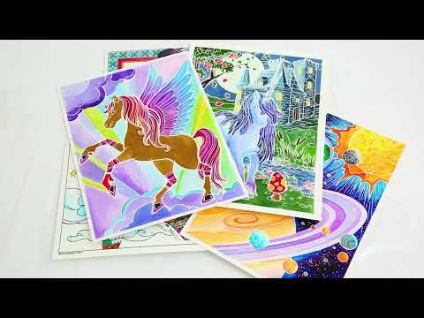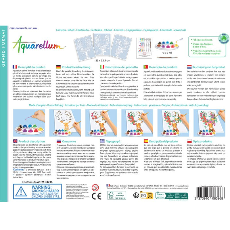 Contient : 3 tableaux sertis 32,5 x 25 cm, 9 flacons d’aquarelles lavables et non toxiques, 1 pinceau aquarelle de très grande qualité, 1 palette pour mélanger les encres, 1 pipette, 1 notice multilingue.