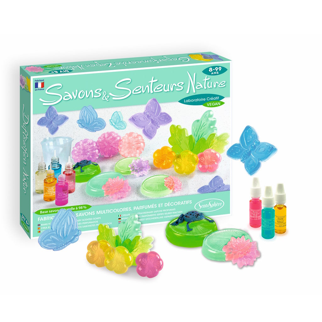 Un coffret de DIY pour faire de beaux savons multicolores sur le thème de la nature : nénuphar, lotus, papillons ou grenouilles.