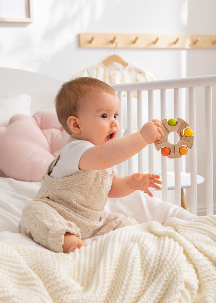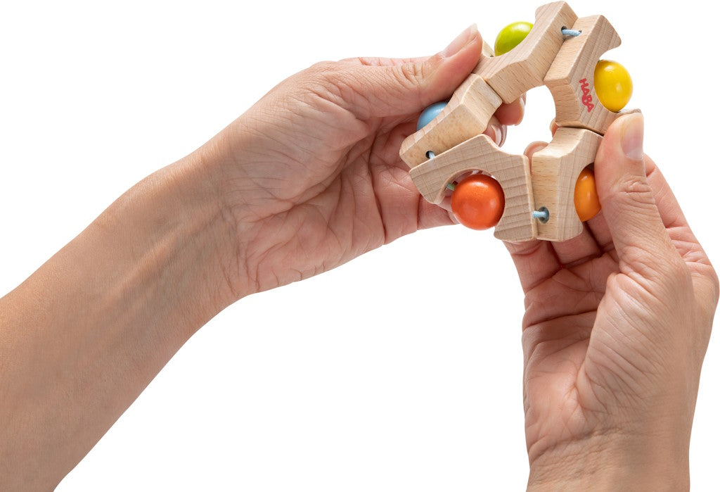 Déjà la vue, puis le toucher : ce hochet captivera les bébés avec ses couleurs gaies et des billes qui cliquètent joyeusement.