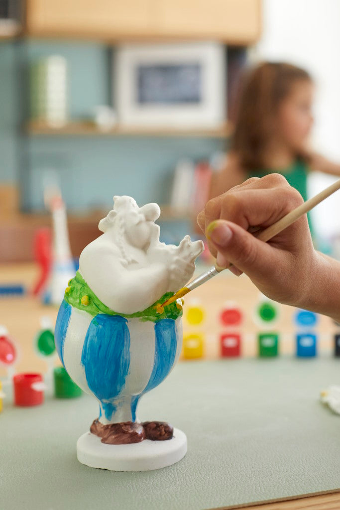 Contient : 1 moule double-coque Obélix collector (15 cm de haut) ; 2 sachets de 300g de plâtre ; 6 pots de peinture acrylique de 5 ml (jaune, rouge, blanc, bleu, vert et noir) ; 1 papier ponce ; 1 cuillère doseuse ; 1 pinceau ; 1 notice de jeu