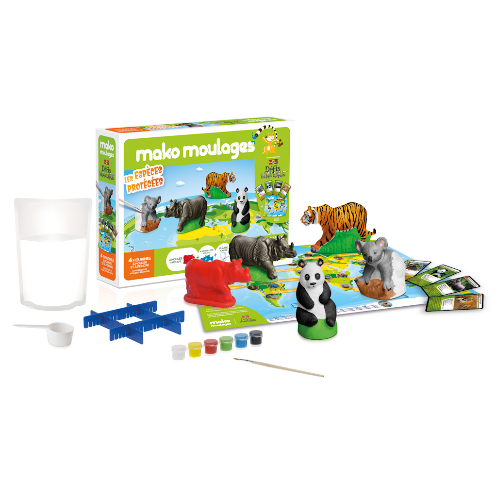 Contient : 4 moules en latex Animaux protégés (le tigre du Bengale, le rhinocéros de Sumatra, le panda géant et le koala) ; 4 cartes Défis Nature ; 1 poster planisphère pour placer ses animaux du monde « à protéger » ; 1 sachet de 800g de plâtre ; 1 cuillère doseuse ; 6 pots de peinture acrylique ; 1 pinceau ; 4 croisillons ; 1 notice de jeu