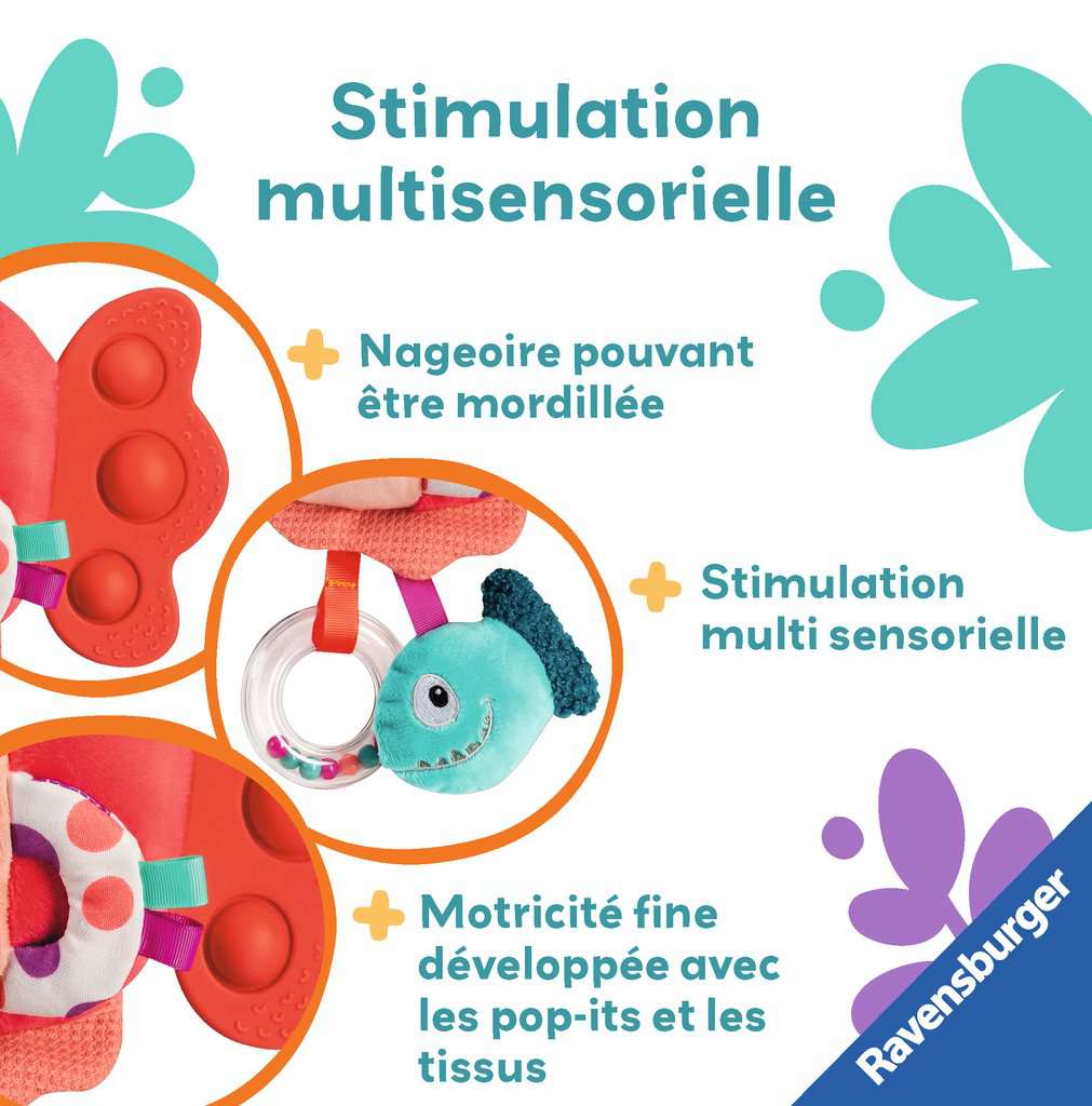 Qu'est-ce qui fait "PLOP" ? Les Pop-It du piranha tout doux font un drôle de bruit lorsqu'on les touche. Aussi, il y a des anneaux, des tissus doux et des effets de crépitement à découvrir pour les plus petits. Les poignées permettent aux plus petits d'attraper, de tenir et de porter facilement le doudou et de développer leur motricité fine tout en jouant. Avec un clip pratique pour attacher à la poussette et au siège bébé. Les bébés ont ainsi une occupation passionnante même en déplacement !