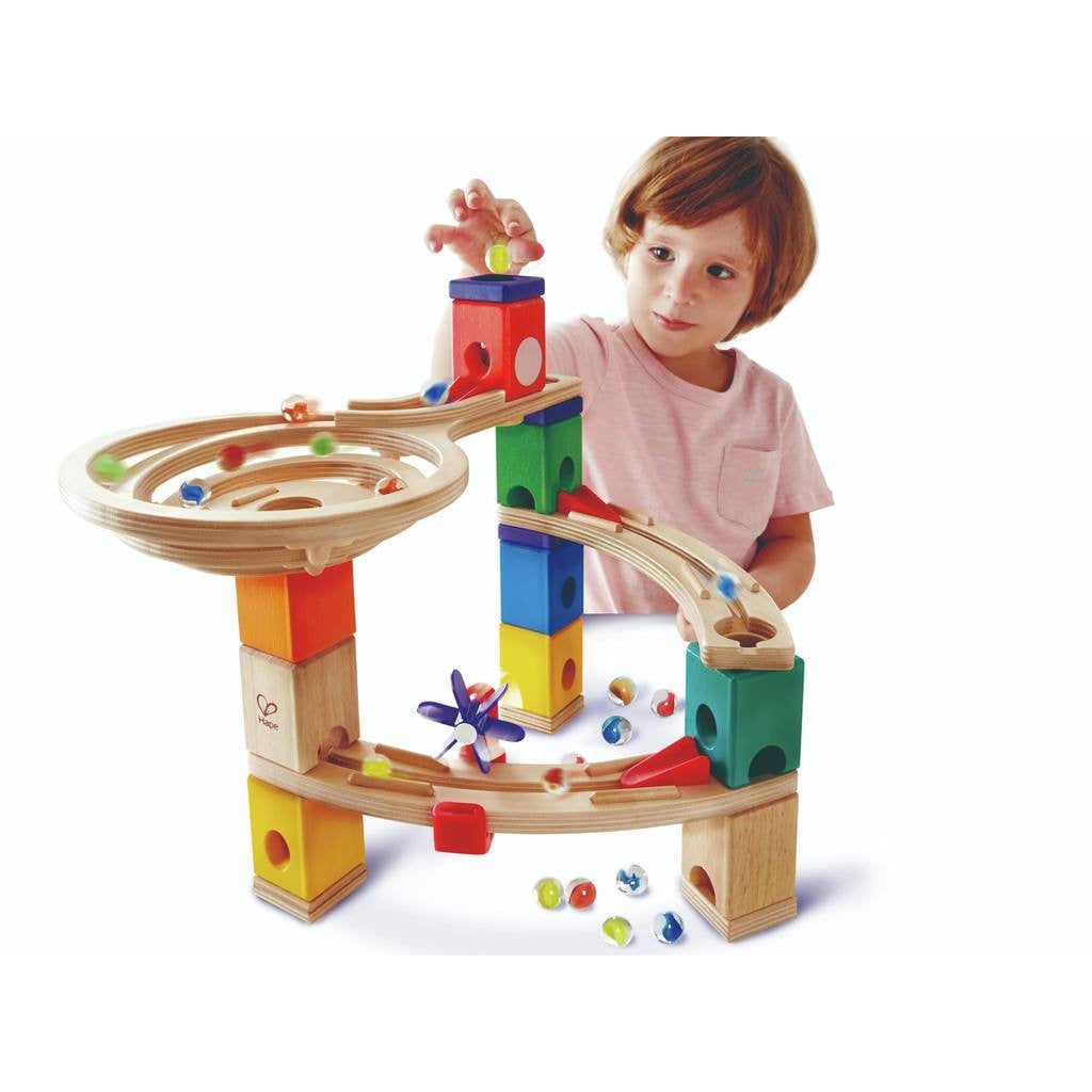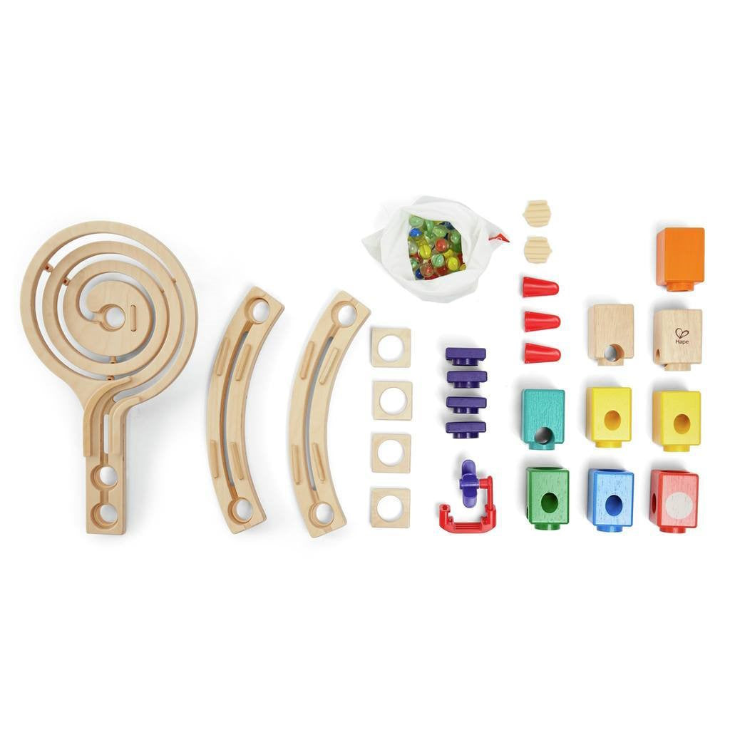 Commencez à construire vos propres circuits de billes avec ce set Quadrilla pour débutants. Déposez deux billes au sommet et observez-les faire la course jusqu'en bas par différents parcours.