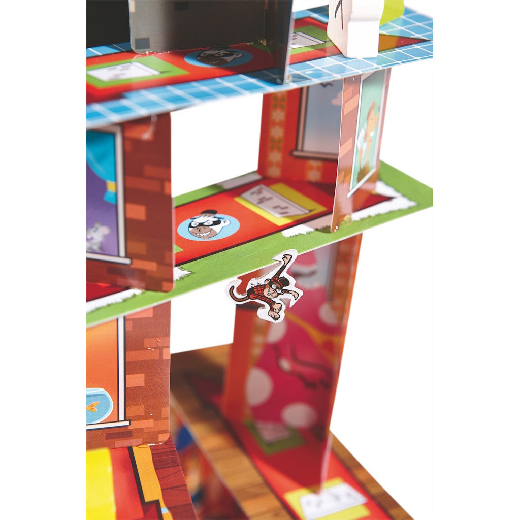 Contient : 1 plateau de jeu (3 tuiles carrées imprimées de chaque côté), 30 planchers, 24 murs bas, 24 murs hauts, 3 dés (rouge/bleu/bleu clair), 4 Spider Monkeys, 4 super héros (Rhino Hero, Super Girafe, Capitaine Éléphant et Pingouin Masqué), 1 médaille du meilleur grimpeur, 1 règle du jeu.