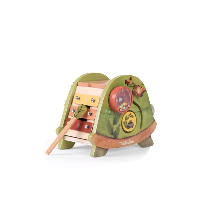 Cette adorable tortue en bois offre 4 faces riches en découvertes de jeux et d'apprentissages. Votre tout-petit pourra s'amuser avec des formes à encastrer, des roues dentées à faire tourner, un xylophone...